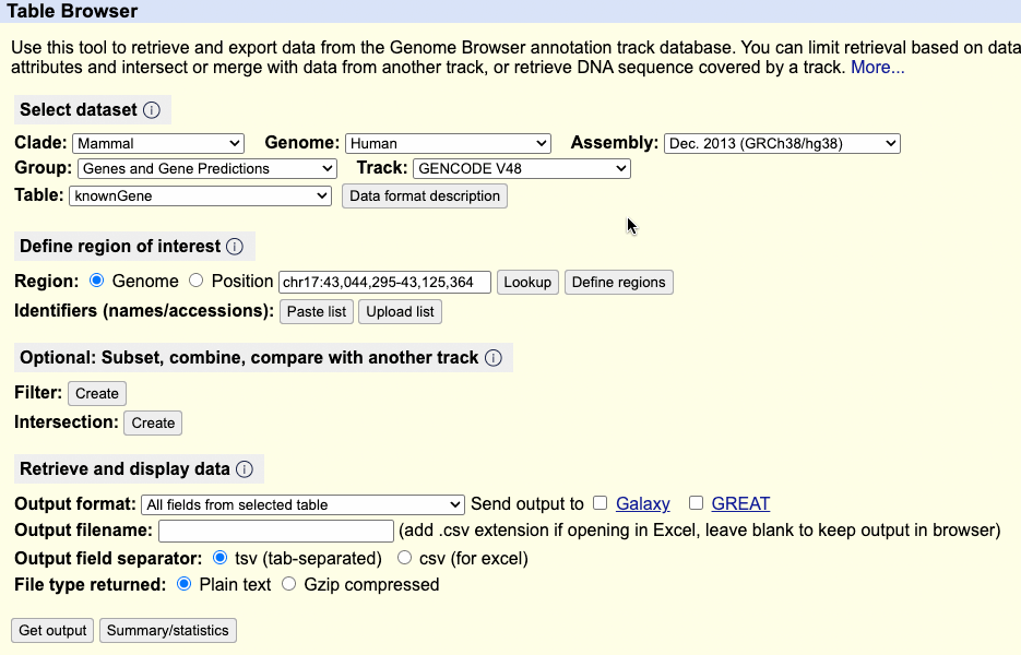 You can limit the output to a specific region or get data genome-wide. Whole-genome output may be unavailable for some tracks due to the large amount of data.