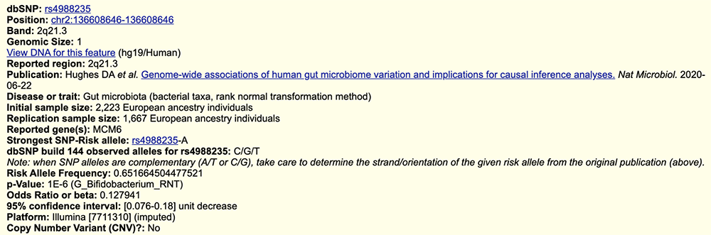 Figure 12. The GWAS page for rs182549, also known as -22018, continued. This report, from a different study, associates the SNV with gut microbiome composition.