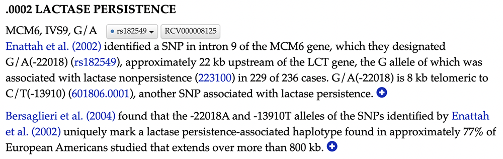 Exploring the OMIM rsID (Figure 10) provides similar results to the first variant. The OMIM data page on the rsID also uses the Enatah et al. publication to confirm this SNV's role in lactase persistence. However, nothing in this OMIM excerpt points to confirmed causation in the same way as the -13910 variant. Instead, this variant is a part of a "lactase persistence-associated haplotype", meaning the variant cosegregates with a haploblock that is associated with LP rather than being a causative allele itself.