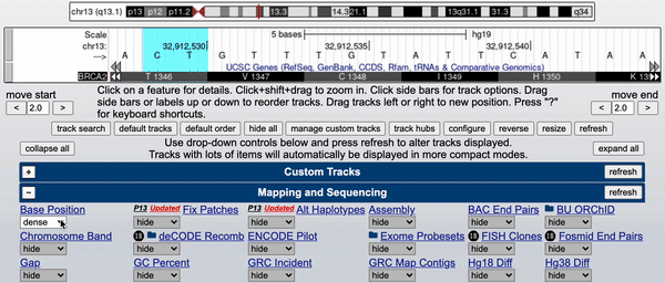 In Figures 1 and 2, the "UCSC Genes" track is displaying exon 11 of the BRCA2 gene. Below the "UCSC Genes" track are two "dbSNP" tracks, "dbSNP153" (upper) and "dbSNP151" (lower); these two tracks are different iterations of the same rsIDs and data, with some differences between the two data releases. The two tracks have different details available when clicking on one track or the other. Checking both versions of the rsID, or "reference SNP" can provide a wide range of insight into a variant.